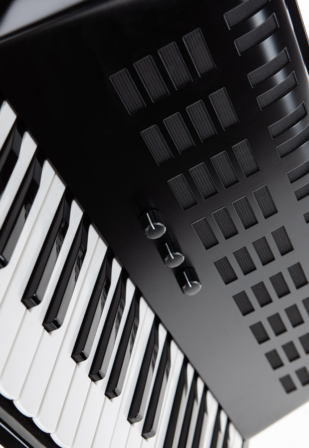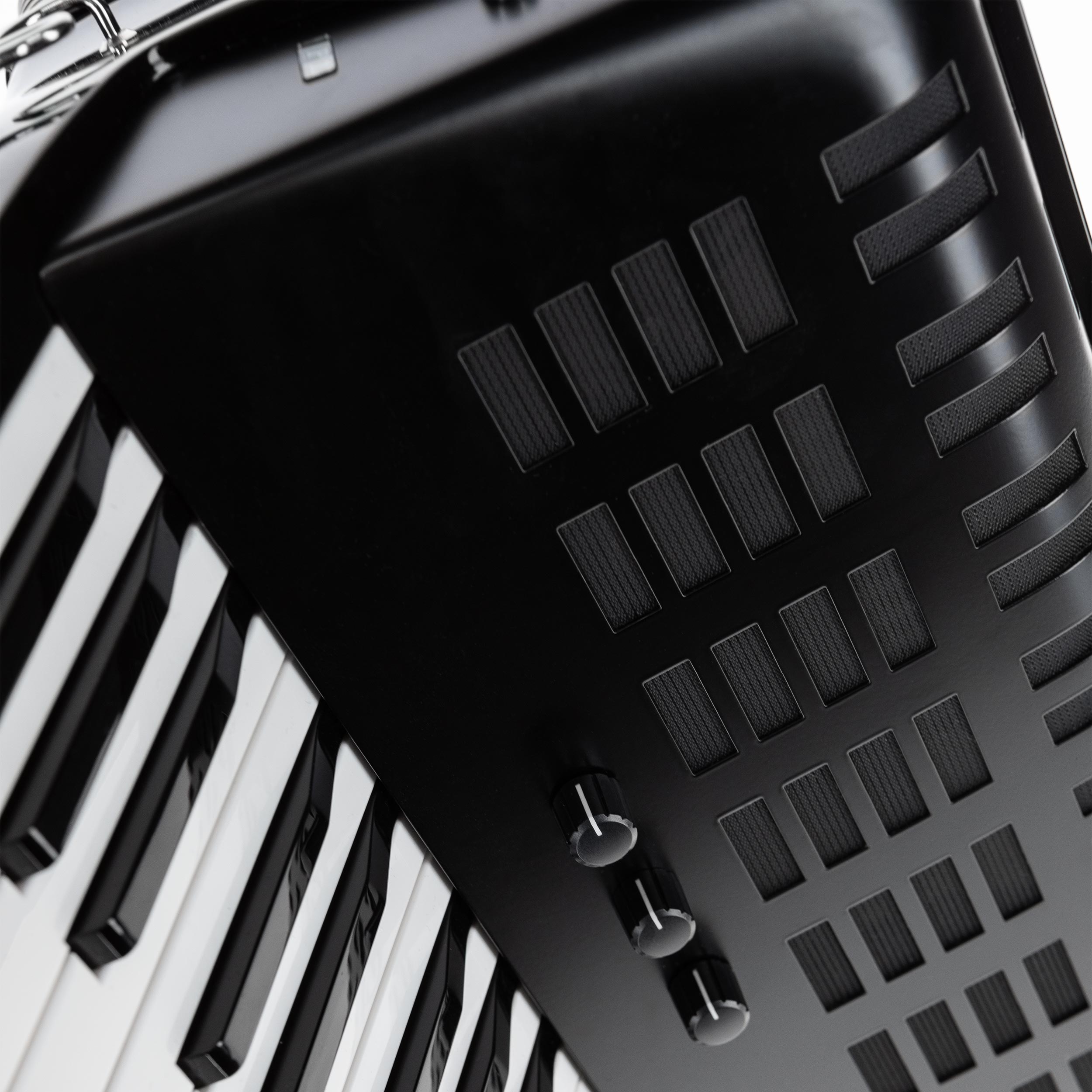 - Die Lautstärke, das Verhältnis von Diskant/Bass+Akkord sowie der Effektanteil (Diskant) lassen sich über drei unauffällige Drehregler direkt und unkompliziert am Instrument einstellen.